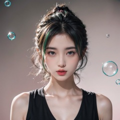 1girl,alluring pose, ,floating hair,,blacklight,(surrounded by bubble:1.3),spotlight, green hair, pink background, dark theme,(a lot of bubble:1.3),eye_contact,