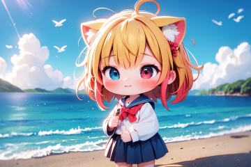 1girl,bangs,beach,bird,black legwear,(heterochromia:1.4),(red eyes:1.4),(blue eyes:1.4),very long blonde hair,cat ears clouds,blue sailor collar,blue skirt,blue sky,blush,red bow,closed mouth,cloud,cloudy sky,condensation trail,day,standing by the sea,