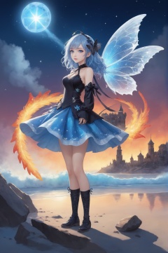 1 girl,solo,korean_text,clear skin texture,colorful,masterpiece,best quality,absurdres,medium breasts,full_shot,((surrounded by heavy floating sand flow and floating sharp stones)),((((ink)))),((illustration)),((watercolor)),((dragon)), ((dragon background)),(blue spark),(red and blue hair),blue eyes, burning sky,flame,Rainbow in the sky,((Flames burning ice)),(((fire butterflies))),(((ice crystal texture wings))),(Flying sparks),(detailed ice),((a lot of luminous ice crystals)),((burning feathers)),(feathers made of ice),(frozen feathers),(((ice and fire together))),hair fluttering in the wind,((mechanical arm armor)),((mechanical body armor)),riding motor, bodysuit,((ruins of city in war, fire, burning cars, burning buildings)),air force fleet in the sky,mecha clothes, robot girl, sliver bodysuit, dragon wings, ((a dragon stands behind the girl)), beautiful detailed sliver dragon armor,((Beautiful butterflies in detail)),((Beautiful stars in detail)),(((halter dress ))),particle,(Starry sky in beautiful detail),(Hazy fog),(Ruins of beautiful details),(((Standing on the surface of the sea))),blonde wavy hair, (shiny long hair), ((Gothic Lolita)), blue white skirt, ((short skirt)), black Headdress, bowknot, (((hair ornament))), (hair flower), Lace, cross-laced footwear, ribbon-trimmed sleeves, building architecture, ((gothic architecture)), starry sky, outdoors, church, (castle),walking, waves, wind,(((glistening light of waves))),(detailed sunset glow),(floating flow),((coral)),(Luminous),coast,(floating colorful bubbles),beautiful detailed sky,(fluorescence),detailed shadow,(conch),beautiful detailed water, starfish, meteor, rainbow,(seabirds),(glinting stars), (glowworm),(splash),detailed cloud, shell,(fireworks),