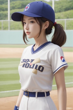 1 girl,solo,korean_text,clear skin texture,colorful,masterpiece,best quality,absurdres,medium breasts,full_shot,baseball_uniform,