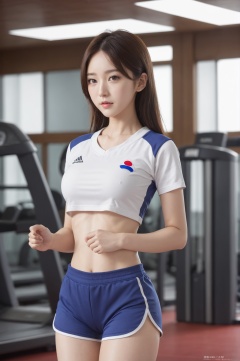 1 girl,solo,korean_text,clear skin texture,colorful,masterpiece,best quality,absurdres,medium breasts,full_shot,gym_uniform,