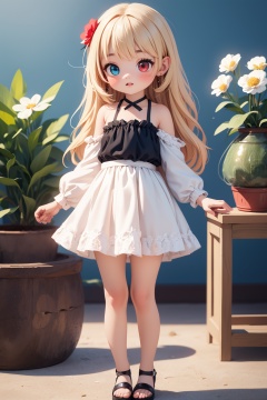 (best quality:1.4),(masterpiece:1.4),(8K:1.4),(extremely detailed:1.4),1girl,(heterochromia:1.4),(red eyes:1.4),(blue eyes:1.4),bare legs,bare shoulders,black footwear,(very long blonde hair:1.2),blue eyes,breasts,cake,cup,dress,flower,hair flower,hair ornament,heterochromia,high heels,lamp,long hair,long sleeves,looking at viewer,parted lips,plant,plate,potted plant,red eyes,solo,thighs,underwear,vase,very long hair,white dress,white flower,standing,