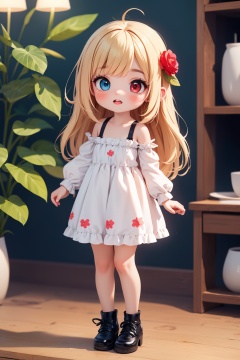 (best quality:1.4),(masterpiece:1.4),(8K:1.4),(extremely detailed:1.4),1girl,(heterochromia:1.4),(red eyes:1.4),(blue eyes:1.4),bare legs,bare shoulders,black footwear,(very long blonde hair:1.2),blue eyes,breasts,cake,cup,dress,flower,hair flower,hair ornament,heterochromia,high heels,lamp,long hair,long sleeves,looking at viewer,parted lips,plant,plate,potted plant,red eyes,solo,thighs,underwear,vase,very long hair,white dress,white flower,standing,