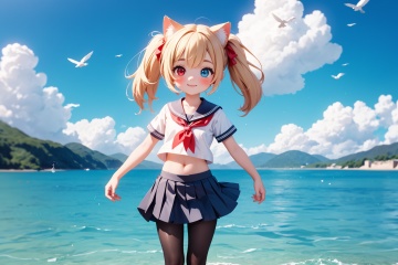 1girl,bangs,beach,bird,black legwear,(heterochromia:1.4),(red eyes:1.4),(blue eyes:1.4),blonde hair,cat ears clouds,blue sailor collar,blue skirt,blue sky,blush,red bow,closed mouth,cloud,cloudy sky,condensation trail,day,eyebrows visible through hair,floating hair,hair bow,horizon,island,lake,lighthouse,very long hair,looking at viewer,midriff,mountain,navel,neckerchief,ocean,outdoors,pantyhose,partially underwater shot,pleated skirt,red neckerchief,sailor collar,school uniform,seagull,shirt,shore,short sleeves,blonde hair,skirt,sky,smile,solo,standing,standing on liquid,sunlight,twintails,wading,water,waves,wet,white shirt,wind,