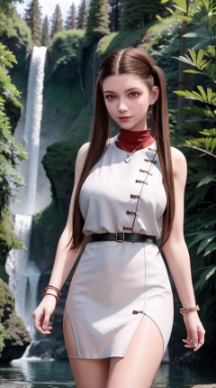 A girl,Black hair,necklace,bracelet,white Dress,(Clothes open),Large breasts,Cleavage of breast,Looking at the viewer,forest,waterfall,lake water,Standing by the lake,,<lora:ad63f8f2f0c45d661f573e19130dcc87606fa6c2cd65cb62d67d1e126846bf3d:0.6>