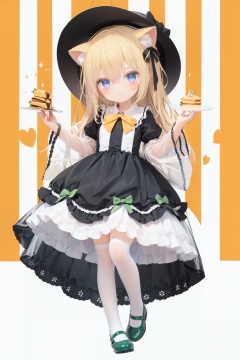 (cinematic lighting), dreamy atmosphere, Ray tracing, (((solo))), (loli:1.5), (child:1.5), (petite:1.5), green eyes, (animal ears), dress, solo, food, blonde hair, open mouth, long hair, pancake, flower, holding, bow, smile, fork, bird, socks, looking at viewer, shoes, striped background, holding fork, bonnet, striped, frills, long sleeves, :d, yellow dress, bangs, eyebrows visible through hair, blush, green nails, hair bow, nail polish, diagonal stripes, chick, sparkle, frilled dress, orange bow, fruit, full body, :3, hair between eyes, green bow, puffy sleeves, heart, lemon, orange footwear, animal ear fluff, white bow, cat ears, bobby socks, orange headwear, see-through sleeves, blue background, striped bow, hair ornament, white legwear, mary janes