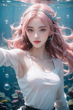 (wide Angle, Low Angle, Underwater, bubble, foam, Super long pink hair floating in the water, upper body:1.5),