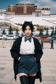 ((masterpiece)),((best quality)),(phot-relistic:1.4),8k,RAW photo,absurdreshyperdetailed,realistic,bokeh,depth of field,(Foreground blur:1.3),Deep Shadow,negative space,Minimalism,film grain,horror photography,vintage tone,high contrast,(dark blue theme:1.1),professional photography photos,emptiness,1girl,elegant,(sad:1.2),lazy,gloom,huge breasts,looking at viewer,(black thighhighs:1.6),dutch angle,<lora:Potala_muggle:0.6>,Potala muggle,building,outdoors,photo background,real world location,