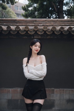((masterpiece)),((best quality)),(phot-relistic:1.4),8k,RAW photo,absurdreshyperdetailed,realistic,bokeh,depth of field,(Foreground blur:1.3),Deep Shadow,negative space,Minimalism,film grain,horror photography,vintage tone,high contrast,(dark blue theme:1.1),professional photography photos,emptiness,1girl,elegant,(sad:1.2),lazy,gloom,huge breasts,looking at viewer,(black thighhighs:1.6),dynamic_angle,<lora:gongqiang_muggle:0.6>,beijing muggle,building,outdoors,east asian architecture,blue sky,cloud,close-up,half-body portrait,beautiful Chinese girl,9:16 aspect ratio,no black borders,dancing,early morning fog,classical dance costume,long hair,wind-blown sleeves,fuller body,fuller face,smiling expression,camera gaze,blurry green vegetation background,hazy morning light,highly realistic style,real photograph resemblance,<lora:小樱花Sakurachan:0.3>,