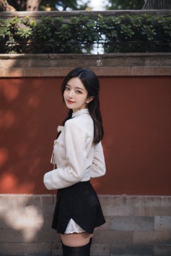 ((masterpiece)),((best quality)),(phot-relistic:1.4),8k,RAW photo,absurdreshyperdetailed,realistic,bokeh,depth of field,(Foreground blur:1.3),Deep Shadow,negative space,Minimalism,film grain,horror photography,vintage tone,high contrast,(dark blue theme:1.1),professional photography photos,emptiness,1girl,elegant,(sad:1.2),lazy,gloom,huge breasts,looking at viewer,(black thighhighs:1.6),from_side,<lora:gongqiang_muggle:0.6>,beijing muggle,building,outdoors,east asian architecture,blue sky,cloud,close-up,half-body portrait,beautiful Chinese girl,9:16 aspect ratio,no black borders,dancing,early morning fog,classical dance costume,long hair,wind-blown sleeves,fuller body,fuller face,smiling expression,camera gaze,blurry green vegetation background,hazy morning light,highly realistic style,real photograph resemblance,<lora:小樱花Sakurachan:0.3>,