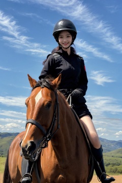 1girl,solo,black hair,realistic,looking at viewer,long hair,smile,<lora:neimenggu_muggle:0.6>,neimenggu muggle,1girl,helmet,sky,gloves,cloud,horse,outdoors,riding,realistic,solo,horseback riding,day,uniform,