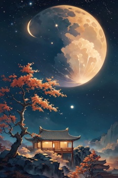 (masterpiece:1.2),best quality,PIXIV,Hanama wine, scenery, tree, sky, no humans, star \(sky\), architecture, east asian architecture, night, moon, night sky, outdoors, bird, starry sky, cloud, building, house<lora:Hanama wine V2-000018:0.8>,