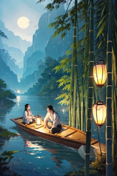 (masterpiece:1.2),best quality,PIXIV,Hanama wine,boat,nature,watercraft,forest,bamboo,lantern,scenery,water,sitting,bamboo forest,outdoors,tree,multiple boys,night,black hair,2boys,long hair,1girl,<lora:Hanama wine V2-000018:0.8>,