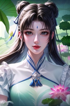 yuanshen, 1girl, lotus, water, lily pad, solo, moon, upper body, dress, jewelry, bracelet, hair bun, black hair, chinese clothes, double bun, flower, blue dress, long hair, night, brown hair, ribbon, partially submerged, nice hands,  perfect balance, looking at viewer, closed mouth, (Light_Smile:0.3), official art, extremely detailed CG unity 8k wallpaper, perfect lighting, Colorful, Bright_Front_face_Lighting, White skin, (masterpiece:1), (best_quality:1), ultra high res, 4K, ultra-detailed, photography, 8K, HDR, highres, absurdres:1.2, Kodak portra 400, film grain, blurry background, bokeh:1.2, lens flare, (vibrant_color:1.2), professional photograph, (narrow_waist),