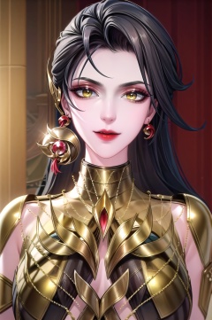 yuanshen, 1girl, black hair, earrings, yellow eyes, jewelry, solo, looking at viewer, makeup, armor, smile, upper body, red lips, long hair, gold armor, shoulder armor, eyeshadow, nice hands,  perfect balance, looking at viewer, closed mouth, (Light_Smile:0.3), official art, extremely detailed CG unity 8k wallpaper, perfect lighting, Colorful, Bright_Front_face_Lighting, White skin, (masterpiece:1), (best_quality:1), ultra high res, 4K, ultra-detailed, photography, 8K, HDR, highres, absurdres:1.2, Kodak portra 400, film grain, blurry background, bokeh:1.2, lens flare, (vibrant_color:1.2), professional photograph, (narrow_waist),