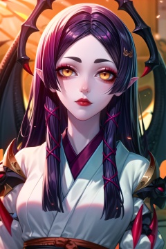 yuanshen,1girl,solo,wings,sharp fingernails,long hair,yellow eyes,fingernails,japanese clothes,pointy ears,long fingernails,black hair,white background,kimono,colored sclera,sash,looking at viewer,wide sleeves,bat wings,slit pupils,hair ribbon,obi,claws,very long hair,ribbon,makeup,demon wings,black sclera,long sleeves,scarlet_moon,rubble_ruins,grave,night,lying in a pool of blood,, nice hands, perfect balance, looking at viewer, closed mouth, (Light_Smile:0.3), official art, extremely detailed CG unity 8k wallpaper, perfect lighting, Colorful, Bright_Front_face_Lighting, White skin, (masterpiece:1), (best_quality:1), ultra high res, 4K, ultra-detailed, photography, 8K, HDR, highres, absurdres:1.2, Kodak portra 400, film grain, blurry background, bokeh:1.2, lens flare, (vibrant_color:1.2), professional photograph, (narrow_waist),