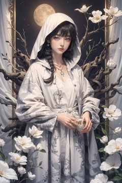 Masterpiece, illustration, 8K wallpaper, super detailed, upper body, 1 girl, white field, holding a flower (surrounded by 3 wolves: 1.2), animal, skull, flower, solo, gray eyes, looking at the audience, white hair, white flowers, white grass, parted lips, dress, jewelry, moon, ring, long hair, bangs, long sleeves, necklace, new moon, glowing, white hooded robe, standing, hair accessories, planet, The hair between the eyes,
