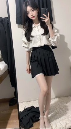 Best quality, 1girl,  xtt's bodyA photo of oneself taken with a phone in front of a mirror ,full body, Wearing black Pleated skirt, wearing pantyhose , kneeling, Mobile selfie perspective, shapely body,midnight,