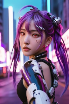 masterpiece, best quality, illustration, beautiful detailed eyes, perfect hands, colorful background, mechanical prosthesis, mecha coverage, emerging dark purple across with white hair, pig tails, disheveled hair, fluorescent purple, cool movement, rose red eyes, beatiful detailed cyberpunk city, multicolored hair, beautiful detailed glow, 1 girl, expressionless, cold expression, insanity, long bangs, long hair, lace, dynamic composition, motion, ultra - detailed, incredibly detailed, a lot of details, amazing fine details and brush strokes, smooth, hd semirealistic anime cg concept art digital painting, cyborg style