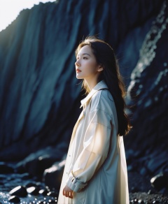 analog film photo,1girl,monkren, chinese girl,cinematic film still,((Establishing_Shot)),((looking away)),expression of enjoyment,an ultra high definition professional high fashion portrait full length photograph,a model wearing a transparent pearlescent raincoat in an icelandic black rock environment at dawn,no artefacts,extremely detailed,stark,refraction,shallow depth of field,volumetric light and shadow,ray tracing,light rays,shallow depth of field,vignette,highly detailed,high budget,bokeh,cinemascope,moody,epic,gorgeous,film grain,grainy . faded film,desaturated,35mm photo,grainy,vignette,vintage,Kodachrome,Lomography,stained,highly detailed,found footage,
