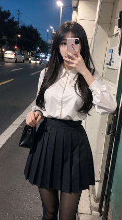 Best quality, 1girl, xtt's body ,full body, Wearing black Pleated skirt, wearing pantyhose , standing, Mobile selfie perspective, shapely body,midnight,outdoors