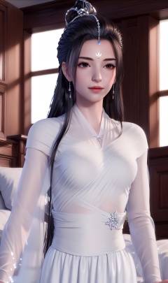 masterpiece,(best quality),official art, extremely detailed cg 8k wallpaper,((crystalstexture skin)), (extremely delicate and beautiful),highly detailed,1girl,solo,long hair,headwear,(standing),( hair),,(long dress:0.955),(clothes:0.999),(dress:0.987),(chinese_clothes:0.897),(long_skirts:0.987),face,lips,(closed mouth),(upper body),(medium breasts),((hair_ornament)),jewelry,earrings,(sunshine, indoor,bed),((looking_at_viewer)),((Facing the camera)),, <lora:hipoly3DModelLora_v10:0.3>