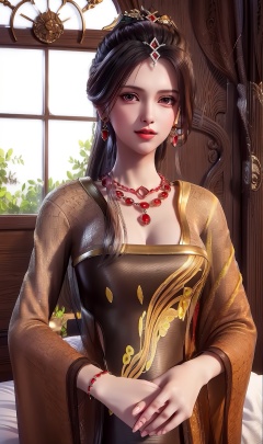 masterpiece,(best quality),official art, extremely detailed cg 8k wallpaper,((crystalstexture skin)), (extremely delicate and beautiful),highly detailed,1girl,solo,long hair,headwear,(standing),( hair),,(long dress:0.955),(clothes:0.999),(dress:0.987),(chinese_clothes:0.897),(long_skirts:0.987),face,lips,(closed mouth),(upper body),(medium breasts),((hair_ornament)),jewelry,earrings,(sunshine, indoor,bed),((looking_at_viewer)),((Facing the camera)),, <lora:hipoly3DModelLora_v10:0.3>