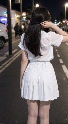 akl,Best quality, 1girl, Drunk, full-body, from behind,long wavy hair, ,white shirt outside, Pleated skirt, night, shapely body,