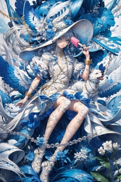 Masterpiece, illustration, 8K wallpaper, super detailed, upper body, 1 girl, white field, blue eyes, blue nails, flower, food, bandaid, blue hair, multicolored hair, hat, chain leash, white dress, popsicle, dress, white footwear, bandaid on arm, leash, solo, white headwear, dog, blue flower, bandaid on leg, sitting, white hair, chain, long hair, holding food, nail polish, holding, hat flower, shoes, sun hat, two-tone hair, looking at viewer, bandaid on hand
