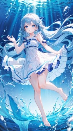 wide shot, (solo:1.3), dramatic angle, (underwater:1.2), masterpiece, best quality, intricate detail, 1girl, swimming, loli, (long hair:1.2), solo, expressionless, blue eyes, looking_up, shoulder strap dress, floating hair, floating clothes, god rays, bubble, barefoot, (full body:1.2), outstretched arm, , perfect hands,
