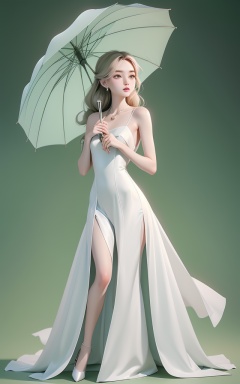 breathtaking Chic and sleek slip dress with delicate spaghetti straps and a silky fabric,design by Stella McCartney (斯特拉·麦卡特尼),Christian Dior (Christian Dior),Pretending to hold a large umbrella,dark green,full body, . award-winning, professional, highly detailed