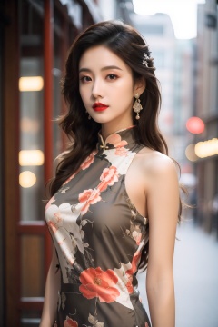 tyqp, 1girl, solo, dress, chinese clothes, china dress, earrings, jewelry, long hair, floral print, blurry background, black hair, blurry, looking at viewer, red lips, sleeveless, sleeveless dress, brown hair, brown eyes, upper body, realistic, lips, outdoors, bare shoulders, arms at sides