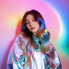1girl, solo, long wavy hair, flowing rainbow colored holographic background, portrait, holographic, iridescent, vaporwave, fluid, niji style, realistic