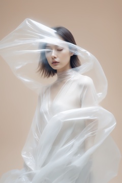 a white image shows a woman covering herself with plastic, in the style of soft focus romanticism, fashion bazaar style, artwork by haruna kikuchi, clean, translucent, abstraction création, uhd image