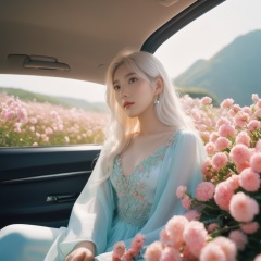 ethereal fantasy concept art of cinematic film still, chinese girl, a girl with white hair sitting in car filled with flowers, art by Rinko Kawauchi, in the style of naturalistic poses, vacation dadcore, youth fulenergy, a cool expression, body extensions, flowersin the sky, ****og film, super detail, dreamy lofi photography, colourful, covered in flowers andvines, Inside view, shot on fujifilm XT4 . shallow depth of field, vignette, highly detailed, high budget, bokeh, cinemascope, moody, epic, gorgeous, film grain, grainy . magnificent, celestial, ethereal, painterly, epic, majestic, magical, fantasy art, cover art, dreamy