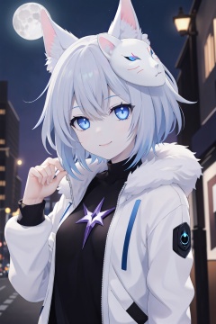 looking at viewer, light smile, closed mouth, blue fire, shirt, jacket, white jacket,