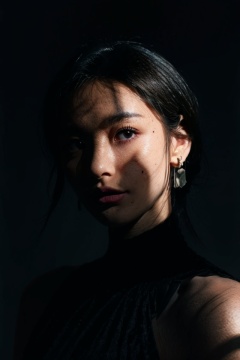 masterpiece,best quality,ultra highres,Professional,Vivid Colors,physically-based rendering,sharp focus,extreme detail description,1girl, Without looking at the camera, half body,,dark theme,upper body,, ,Earring,(dark background:1.2),,(spotlight),Dimples, a beauty mole, a mole on the lips, parted lips,