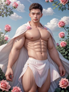 masterpiece,A devout believer,1 Man,(Asian male:0.6),Handsome,26 years old,Ribbon,Magic garden,Ancient Roman dress,sky,day,A pale blue sky,cloud,pink rose,pink flower,textured skin,super detail,best quality,
