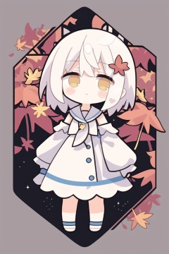 wallpaper,colorful,Tyndall effect,(autumn maple forest:1.3),(very few fallen leaves),(path),stars,flower sea,starry sky,flowers meadows,Dreamy forest,strong rim light, 1girl, bare shoulders, white hair, blinking, white dress, closed mouth, constel lation, yellow eyes, flat color, braid, blinking, white robe, float, closed mouth, constel lation, flat color, looking up, standing, medium hair, standing, solo, , 4349,chibi