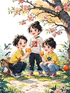 Two happy little boys and a little girl sat on the roof, taking full body photos and laughing happily. The boy is wearing a yellow short sports shirt and red sports shoes, while the girl is wearing a white sports shirt, jeans, white sports shoes, black hair, a house, flowers, and small animals. A happy little boy with a round face, big eyes, long eyelashes, sunset and sunset,<lora:80年代绘本插画_v2.0:0.9>, A ink painting of a tranquil orchard with Chinese writing on it and a pair of birds building their nest, with a fruit-laden branch in the foreground, An Zhengwen, organic painting, a minimalist painting, art & language, ink and wash,