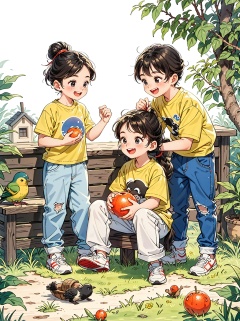 Two happy little boys and a little girl sat on the roof, taking full body photos and laughing happily. The boy is wearing a yellow short sports shirt and red sports shoes, while the girl is wearing a white sports shirt, jeans, white sports shoes, black hair, a house, flowers, and small animals. A happy little boy with a round face, big eyes, long eyelashes, sunset and sunset, <lora:Q版古风手绘插画2.0:0.9>, A ink painting of a tranquil orchard with Chinese writing on it and a pair of birds building their nest, with a fruit-laden branch in the foreground, An Zhengwen, organic painting, a minimalist painting, art & language, ink and wash,