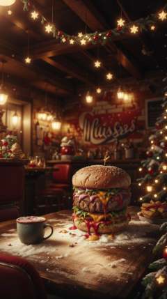 <lora:ChristmasWintery:0.9> ChristmasWintery a juicy cheeseburger served in a nostalgic 1950s diner, (Masterpiece:1.3) (best quality:1.2) (high quality:1.1)