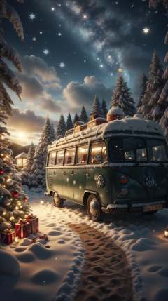 <lora:ChristmasWintery:0.7> ChristmasWintery a retro Volkswagen bus parked at a campsite near a sandy beach, (Masterpiece:1.3) (best quality:1.2) (high quality:1.1)