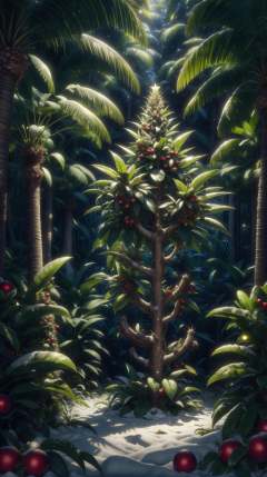 <lora:ChristmasWintery:0.8> ChristmasWintery lush banana plants laden with ripe fruit in a tropical forest, (Masterpiece:1.3) (best quality:1.2) (high quality:1.1)
