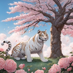gufengstyle,masterpiece, Little tiger, Lovely, In the middle of the picture, Mid-range, Outdoor, Light blue sky, Clouds, Garden, Big tree, Pink roses, Collar, Furry, Twelve signs of the Chinese zodiac, textured skin, super detail, best quality<lora:gufengstyleSDXL-000016:1>