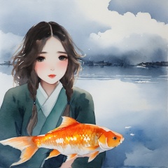gufengstyle,liyu, A big fish beside the girl, solo,  goldfish, looking at viewer,big fish, (cloud:1.1), watercolour<lora:gufengstyleSDXL-000017:0.9>