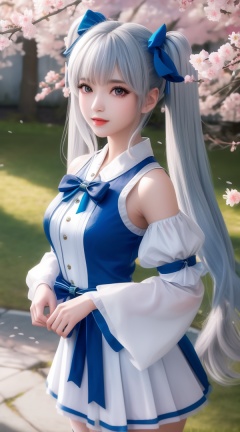 (,1girl, ,best quality, ),looking at viewer, <lora:380-DA-武动乾坤-林青檀:0.8> ultra detailed background,ultra realistic 8k cg,ultra detailed 8k cg,masterpiece,upper body,  (( , )),, ,science fiction,mole, ultra realistic 8k cg, ,tamari \(flawless\),   ,outdoors, sun,sunlight, cherry blossoms,      (()), (), 1girl, solo, blue_ribbon, detached_sleeves, ribbon, long_hair, twintails, thighhighs, bow, blue_sleeves,silver hair,