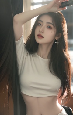 HDR,UHD,8K,A real person,Highly detailed,best quality,masterpiece,1girl,realistic,Highly detailed,(EOS R8, 50mm, F1.2, 8K, RAW photo:1.2),ultra realistic 8k,(best illumination, best shadow, extremely delicate and beautiful),(official art, beautiful and aesthetic:1.2),solo,1girl,flowing hair,Dynamic pose,looking_at_viewer,perfect body,1girl,solo,jewelry,long hair,earrings,bag,shirt,black hair,crop top,midriff,standing,oily skin,xiaoju,applying_makeup,mole,(illumination),sunlight shining on the face,