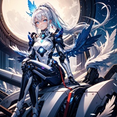{{masterpiece}}, flat chestbest quality},{highres},solo,flat_chest,a girl inside the church with white hair and blue pupil surrounded by {many} glowing {feathers} in cold face,detailed face,night with bright colorful lights whith richly layered clouds and clouded moon in the detailed sky,{a lot of glowing particles},high ponytail,mecha clothes,robot girl,cool movement,sliver bodysuit,{filigree},delicate and (intricate) hair,((sliver)) and (broken) body,blue streaked hair,full body,Depth of field, sitting on a {blue star}