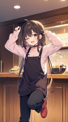 1girl, 1boy, apron, one eye closed, shirt, smile, sweater, white shirt, pants, long hair, collared shirt, black pants, green apron, brown eyes, black hair, ladle, ;d, brown hair, holding, indoors, long sleeves, puffy long sleeves, off-shoulder sweater, very long hair, off shoulder, slippers, standing, bangs, puffy sleeves, bowl, arm up, dress shirt, standing on one leg, open mouth, black eyes, black choker, pink sweater, brown sweater, sweater dress, holding bowl, choker, blush, ahoge, twitter username